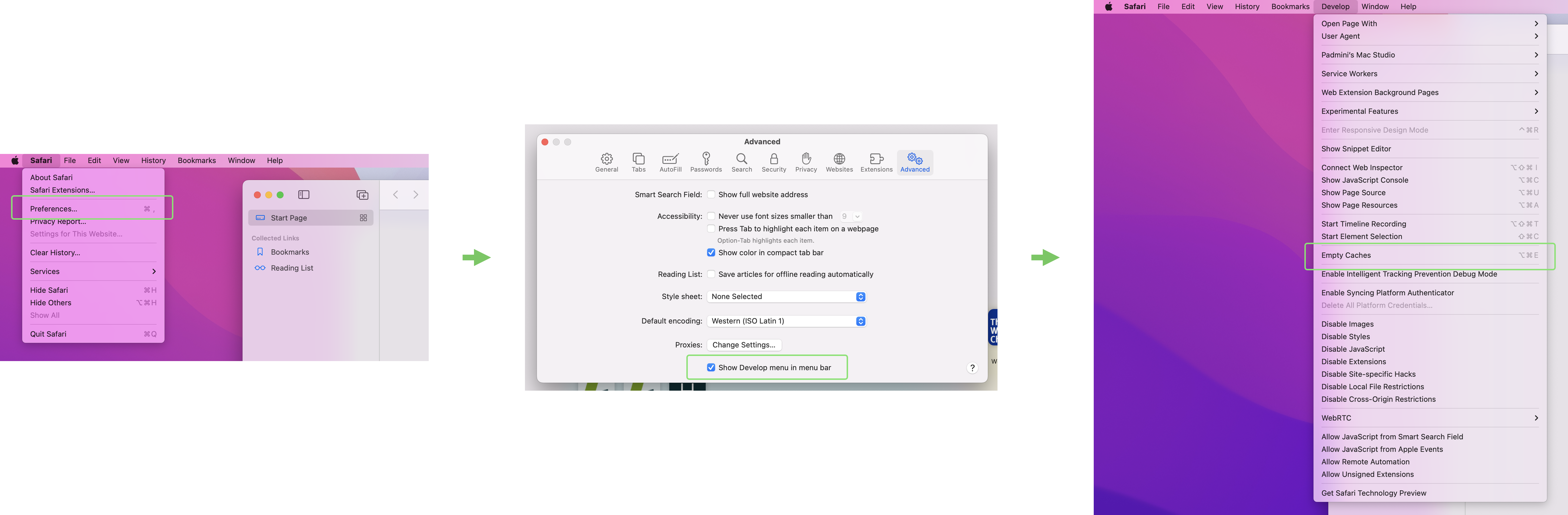 In the menu bar, select Develop > Empty Caches.