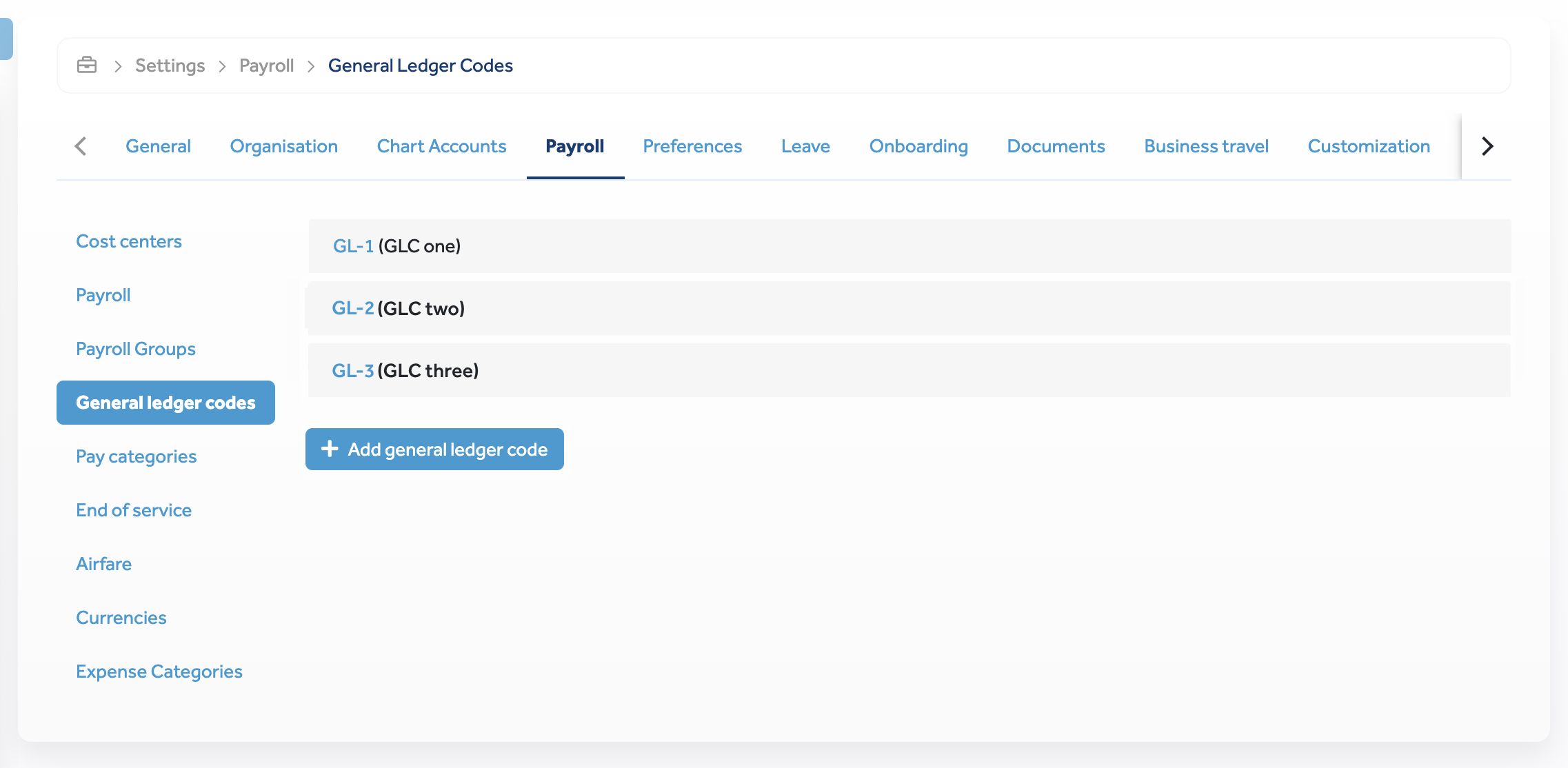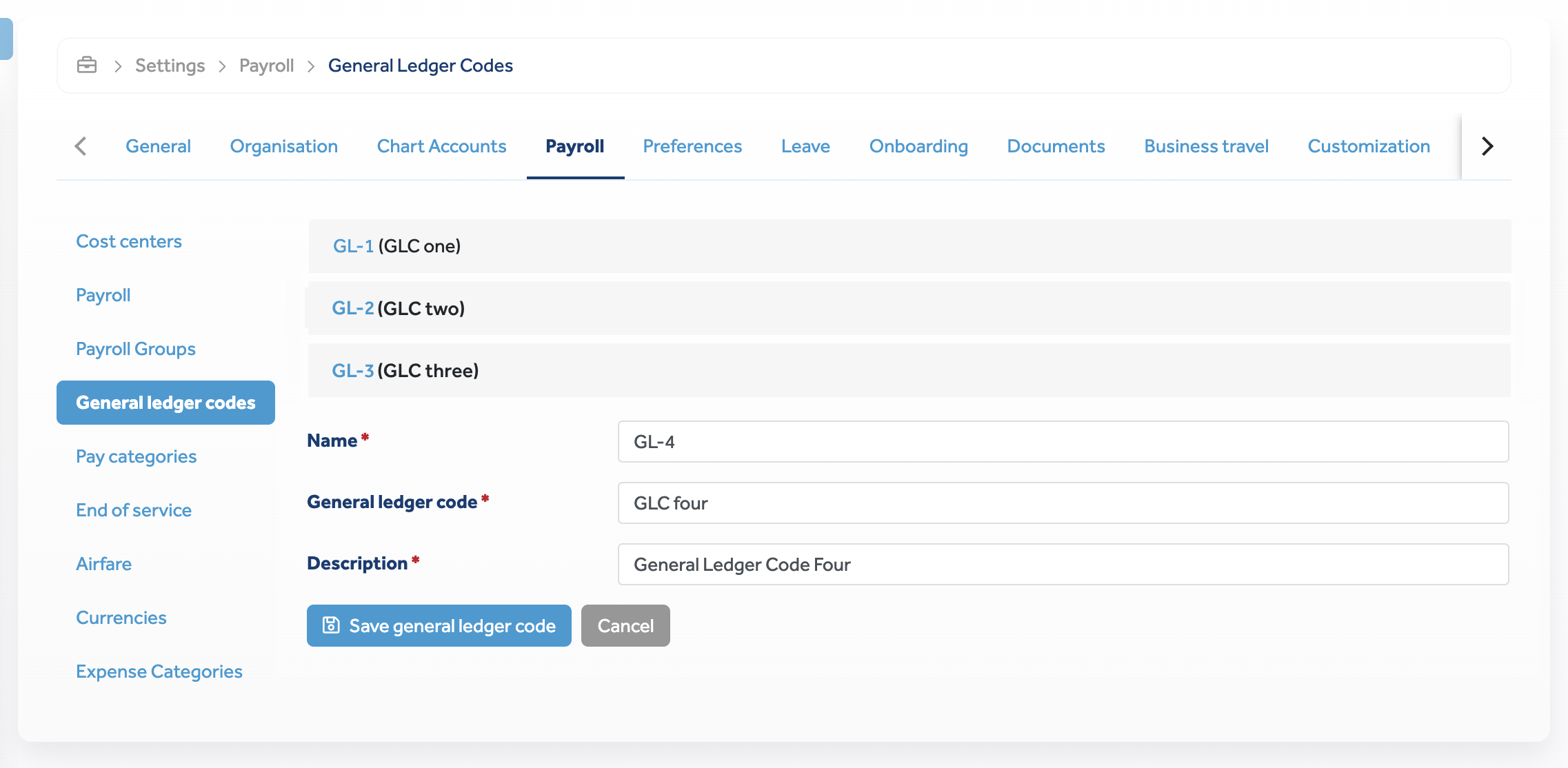As a payroll or platform admin, you can create GL codes. Do the following:
