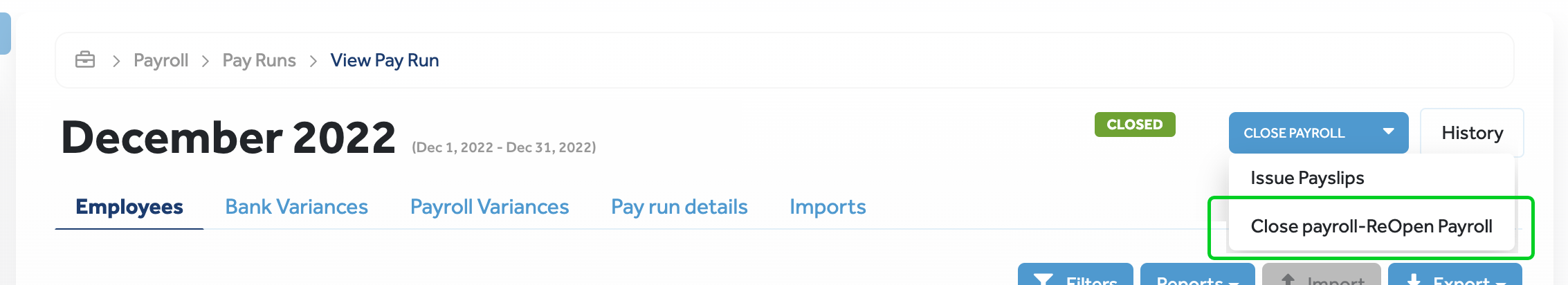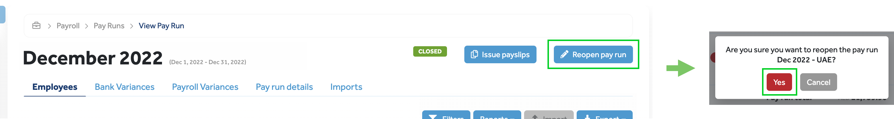 If no pipeline is configured, in the upper-right corner of the pay run, click Reopen pay run and in the confirmation message, click Yes.