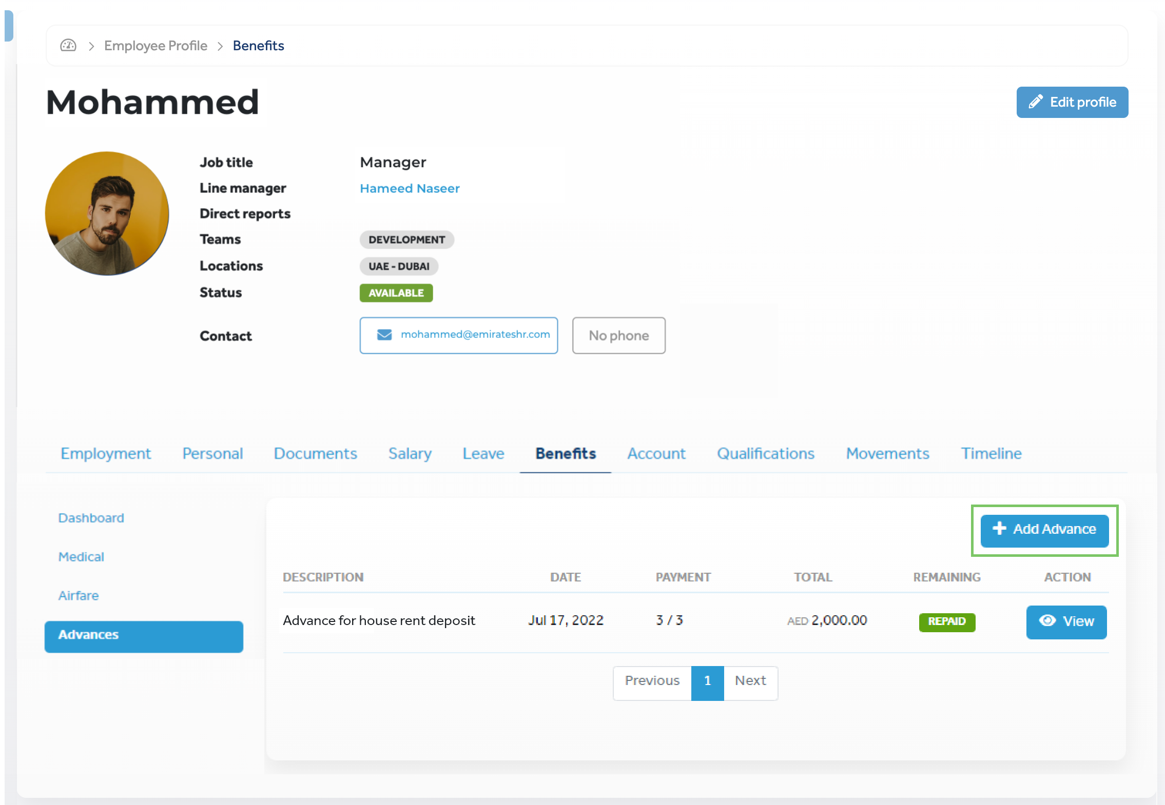 Employee profiles display information about advances in the Benefits > Advances tab. In this tab, you can do the following: