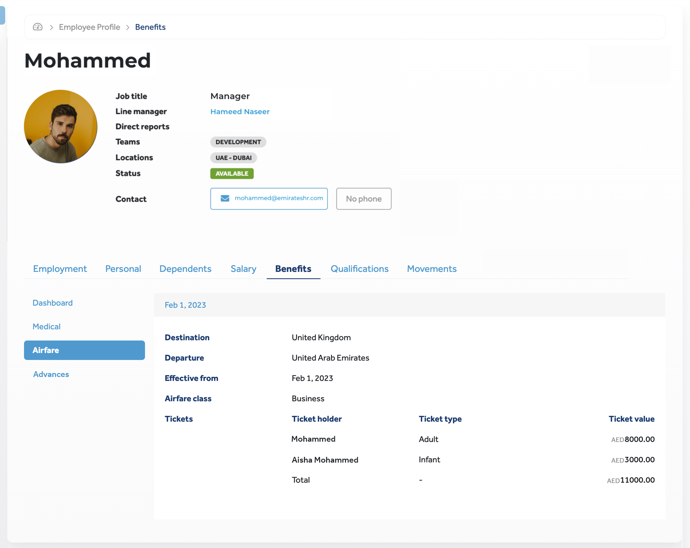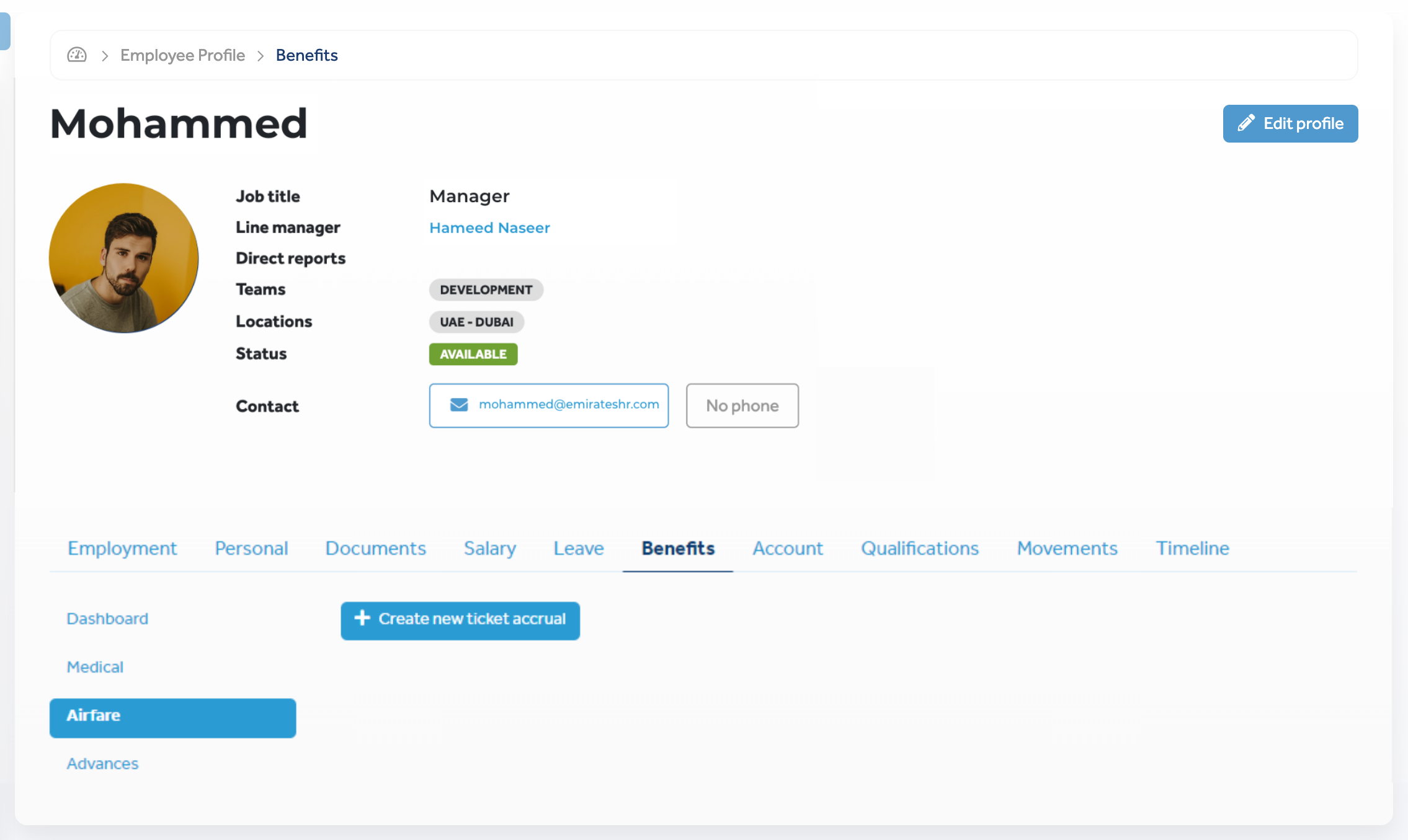 Employee profiles display information about airfares in the Benefits > Airfare tab. In this tab, you can do the following: