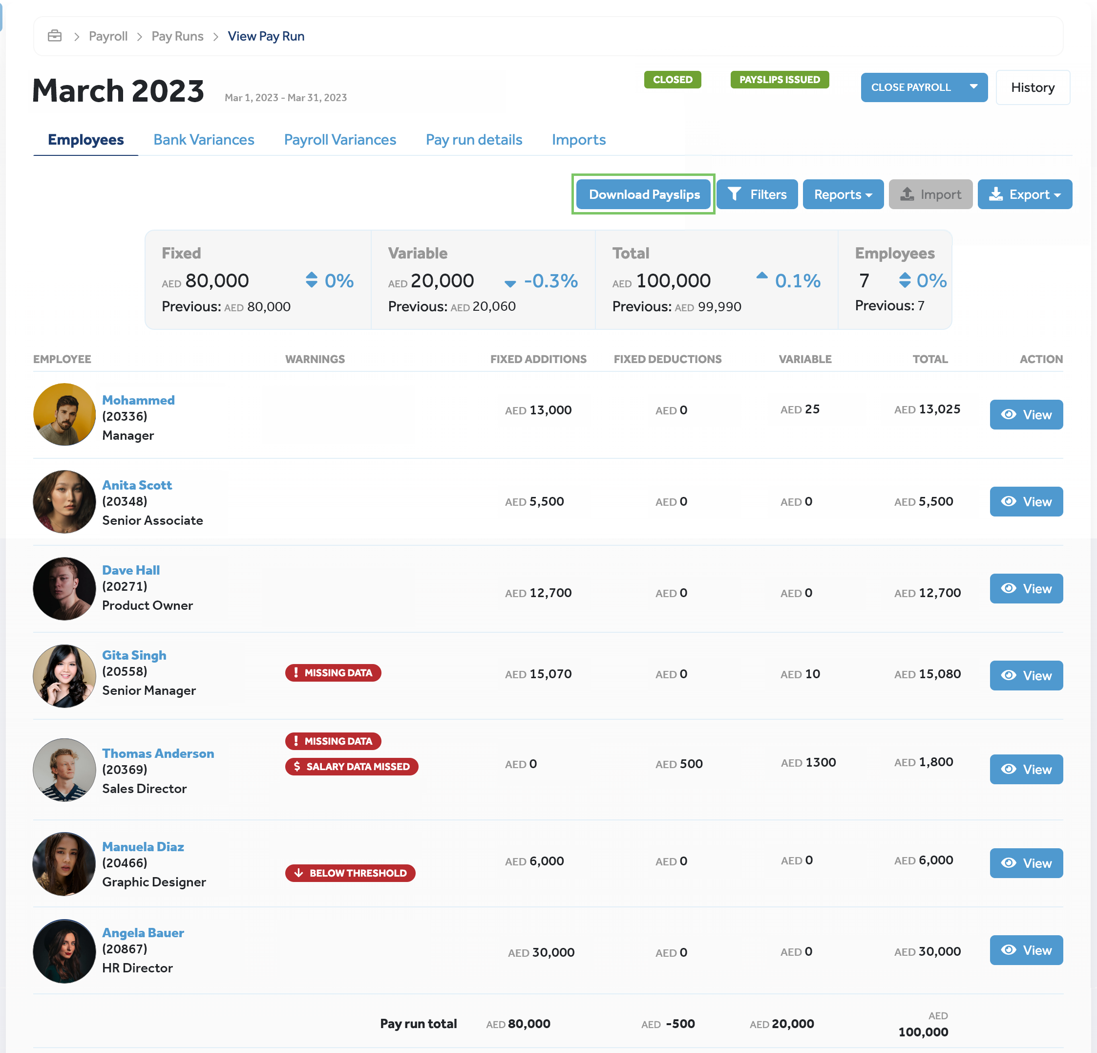 | An issue with displaying updated salaries in filtered pay runs | Previously, filtered pay runs did not display updated salaries for employees whose salaries were manually updated from their payroll profile. The correct values displayed only when the page was refreshed, which reset the filter. This issue is fixed now. |