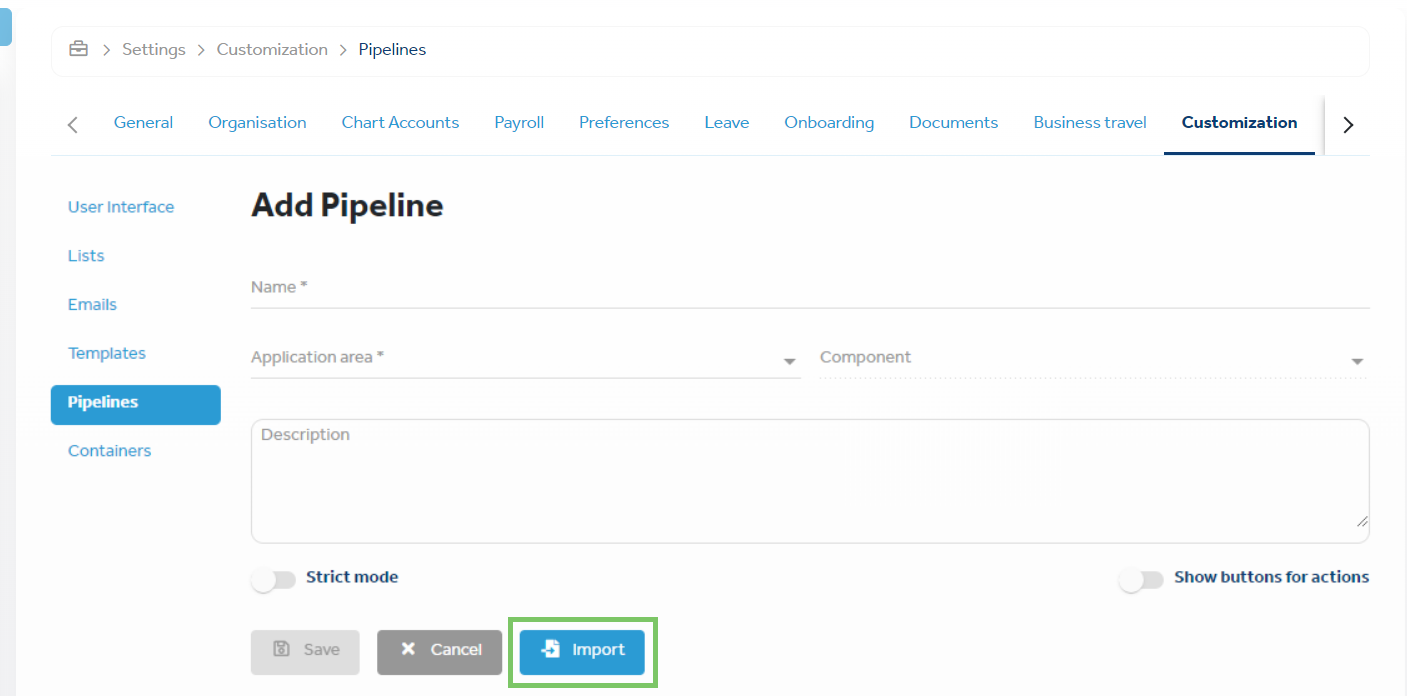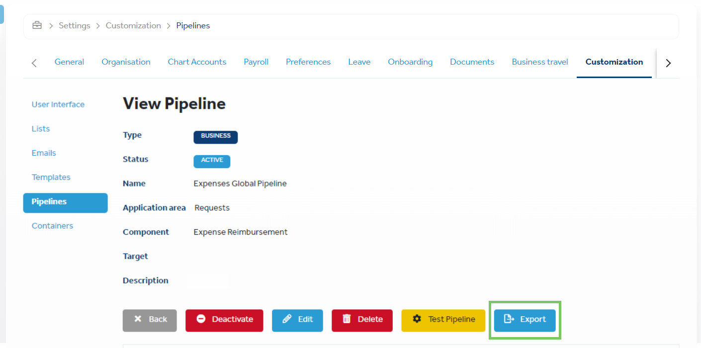 As a platform admin, you can export any pipeline and import it back into the platform. This facilitates quick and easy sharing of pipelines, with all the required settings configured, across businesses, so that you can reuse or use them as a template. To export a pipeline, on the View Pipeline page, click Export. The pipeline is exported as a .ehr file, which is a zipped folder that contains all the files that define the pipeline's schema. To import the previously-exported pipeline onto the platform, on the Add Pipeline page, click Import and upload the .ehr file. For more information
