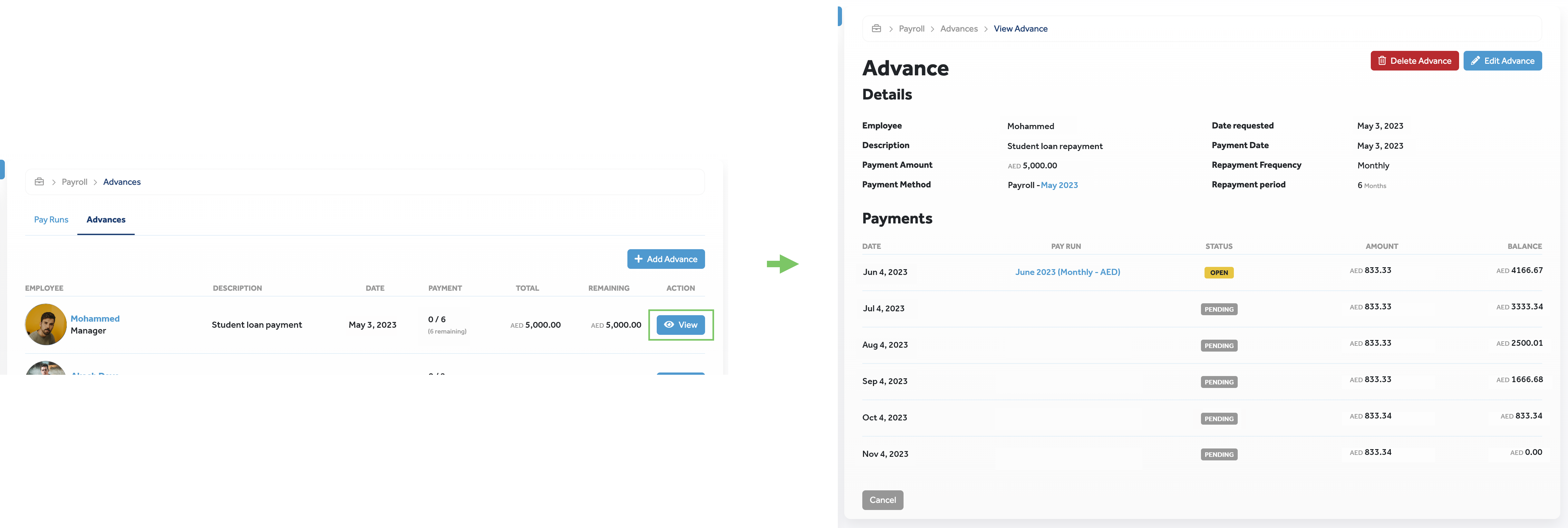 In this tab, you can click View in the Action column to view and manage any advance (similar to working with advances in Payroll).