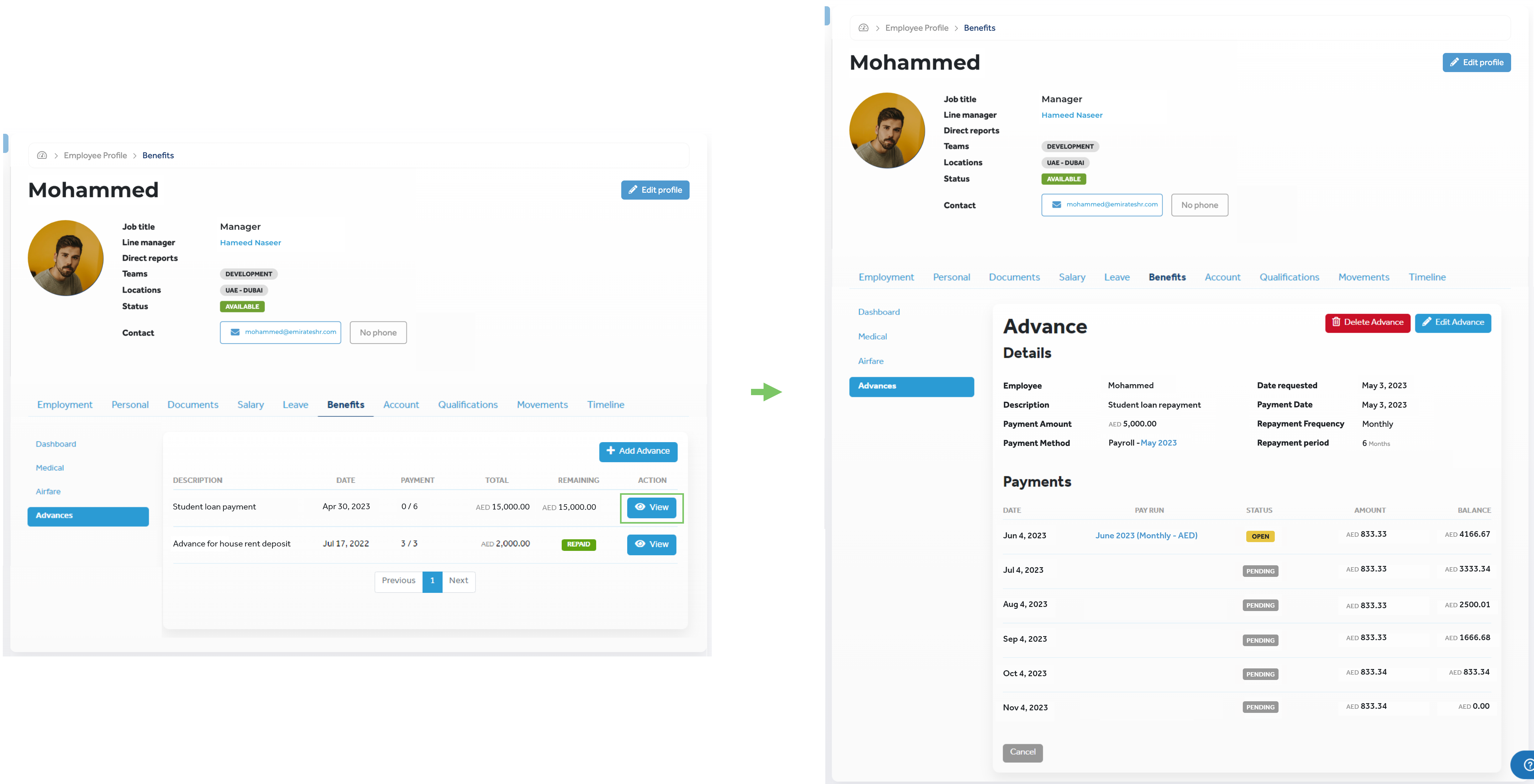 You can also add, view, and manage salary advances for any employee individually in the Benefits > Advances tab on the employee's profile.