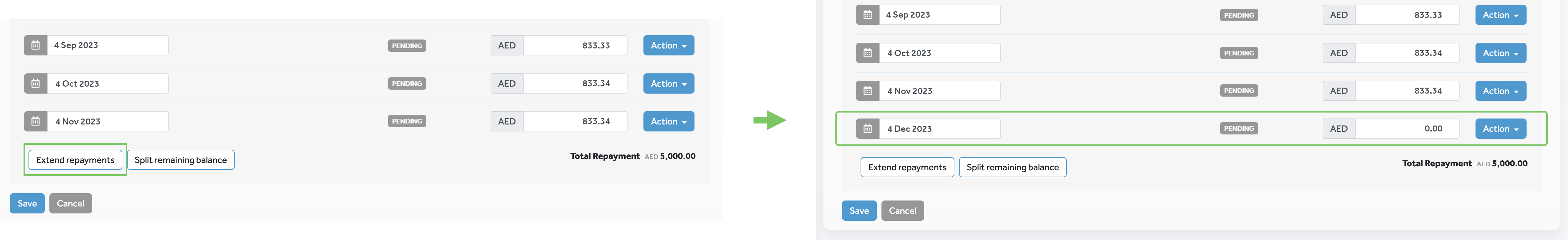 The sum of installments must equal the total repayment amount. Therefore, when extending the repayment schedule, you might also need to edit one or multiple unpaid installment amounts to correct the total.