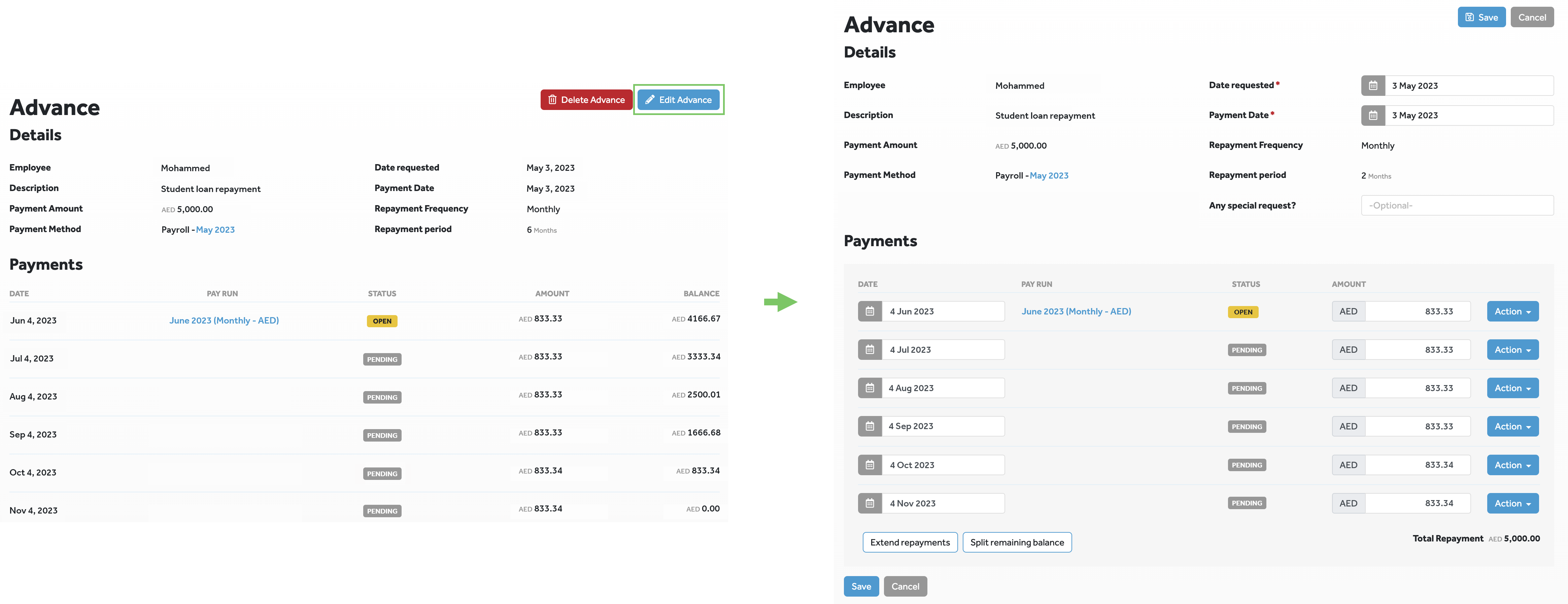 As a payroll or platform admin, you can edit an advance to customize its details, repayment schedule, installment amounts, or manually override the status of any repayment.