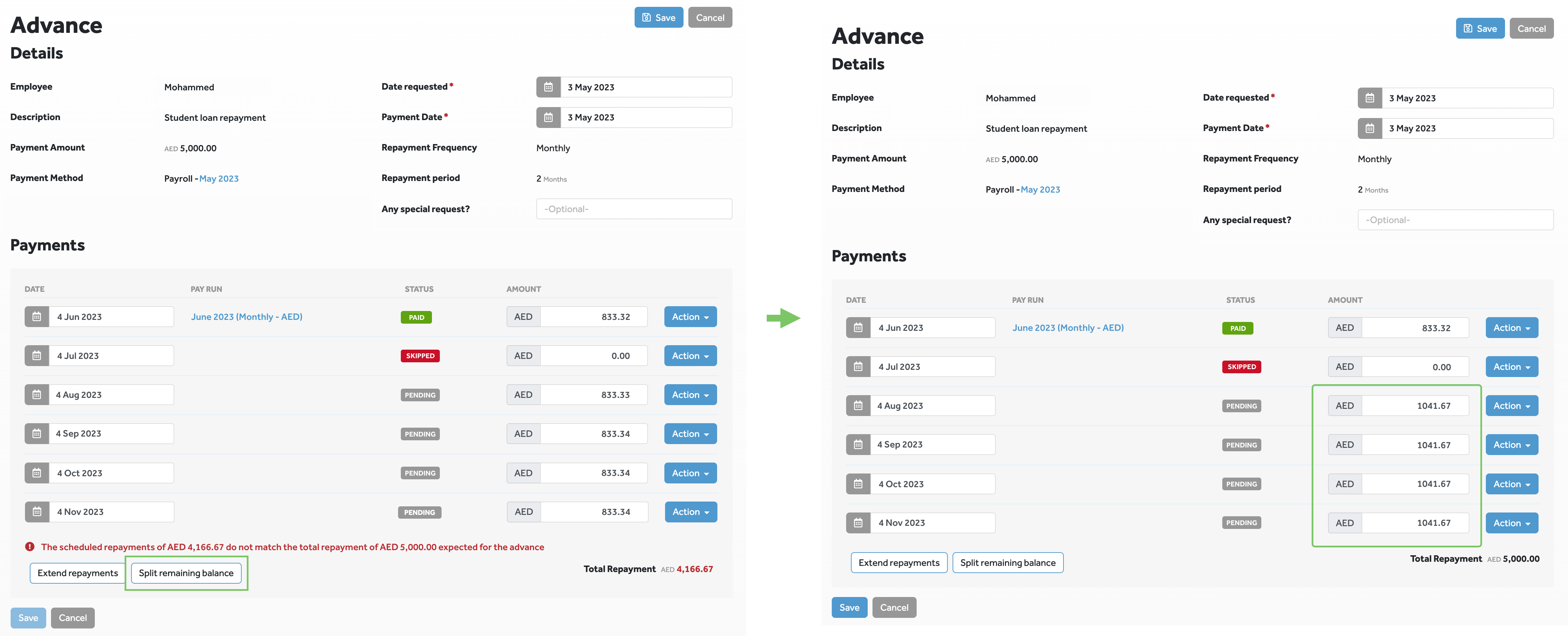 To split and evenly distribute the repayment amount still due across available pending installments, click Split remaining balance at the bottom of the Payments section.