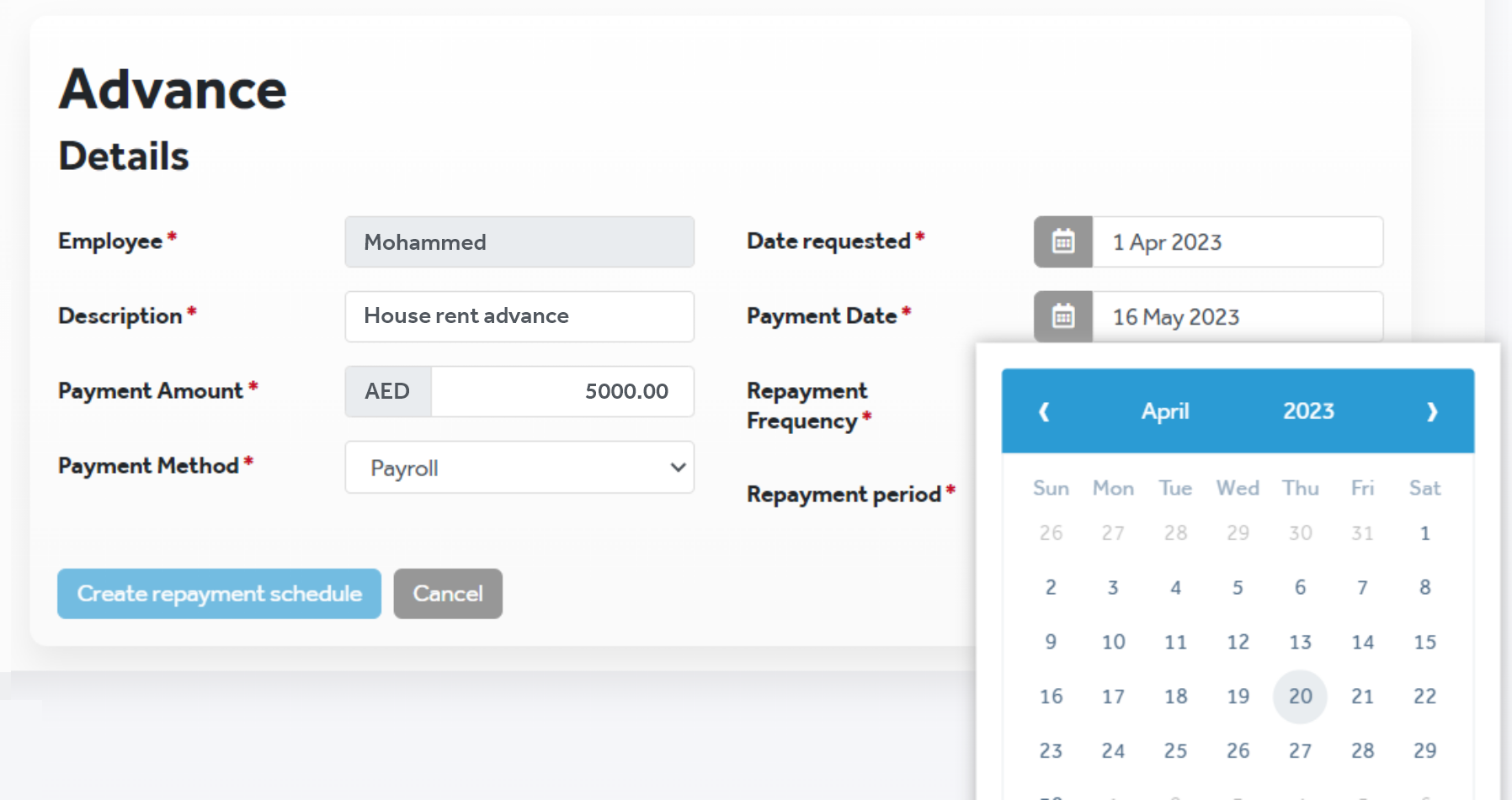 When adding advances for employees from Payroll or their profile, you can configure past dates for the Date requested and Payment Date fields. Previously, you could only add advances with request and payment dates in the future. |