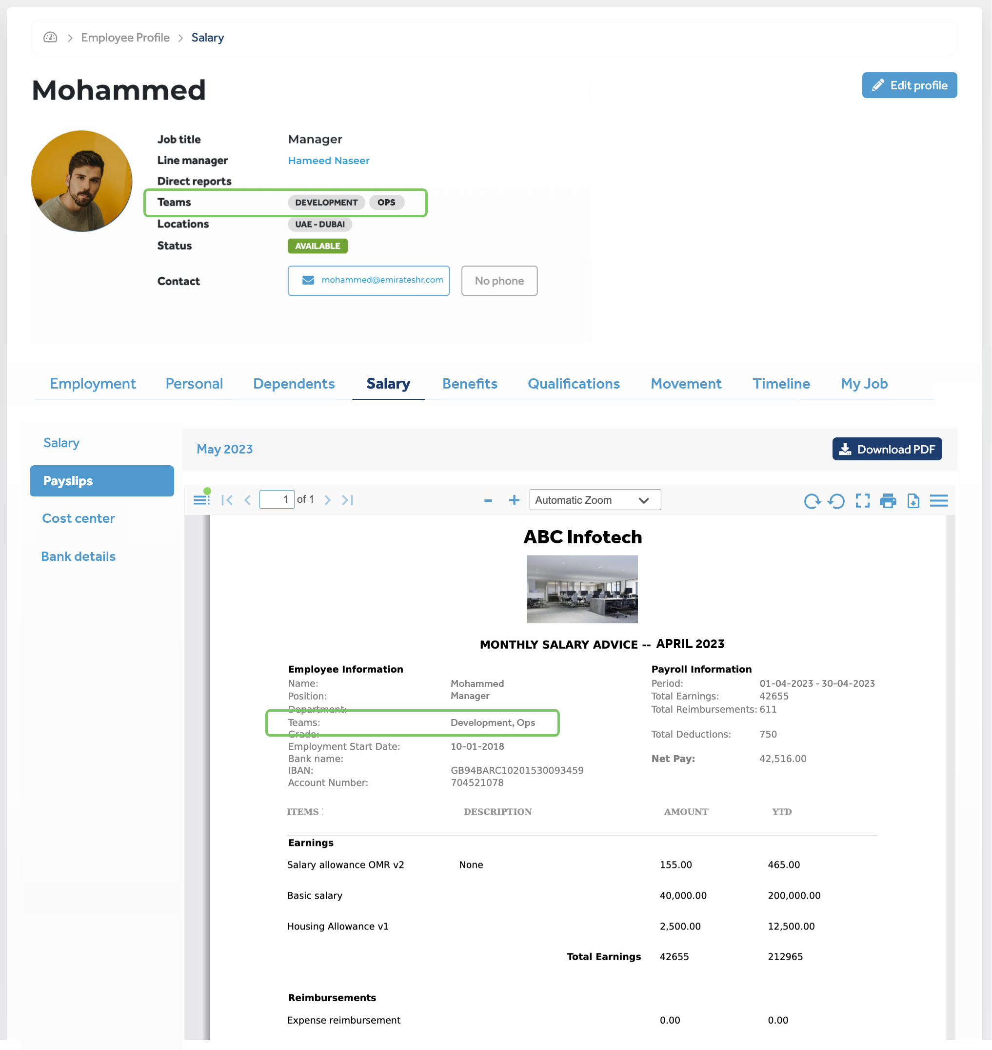 Payslips display the teams that the respective employees are a part of at the time of creating the pay run. |