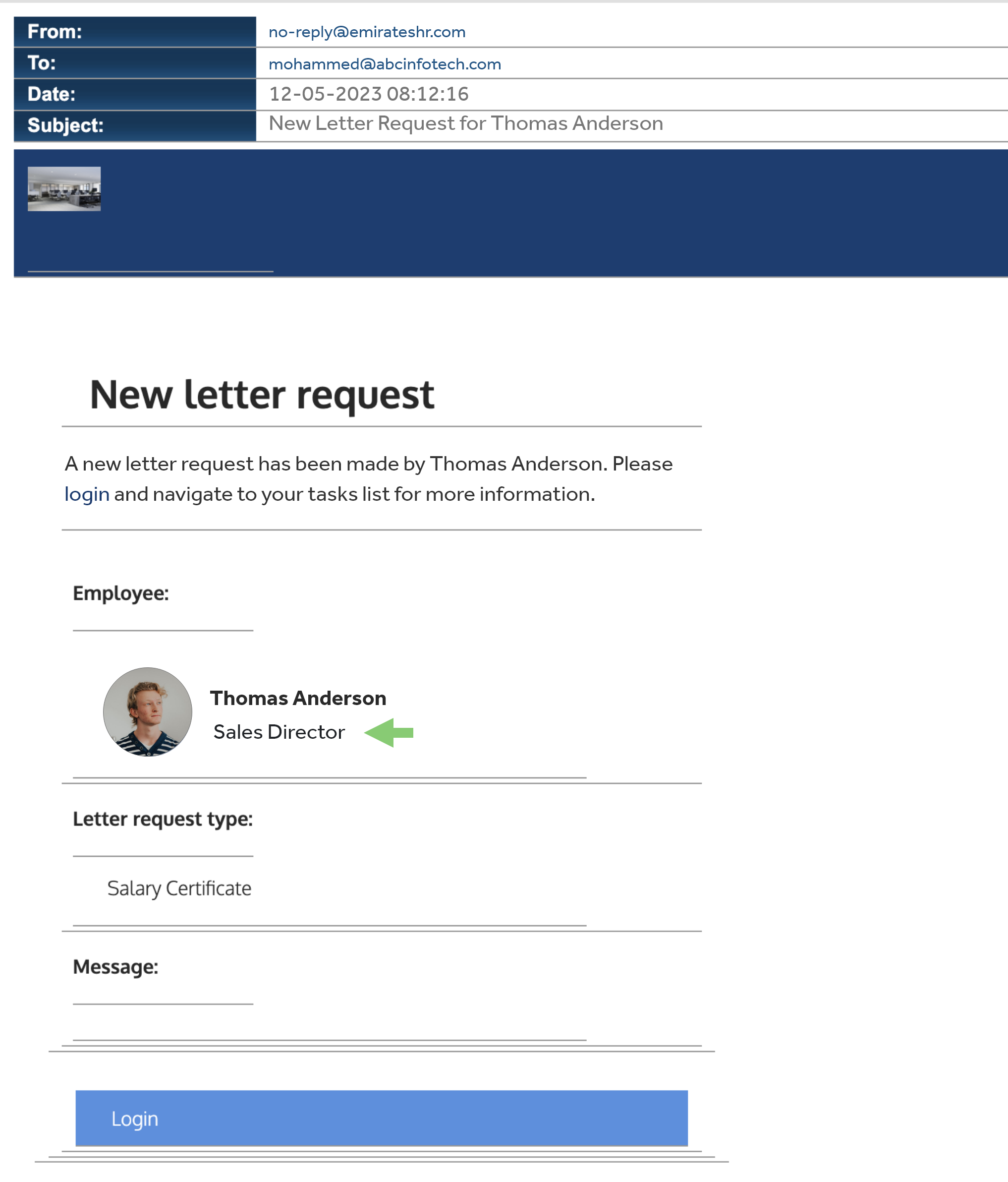 Notification emails sent to approvers about letter requests from employees display the requestor's job role. |