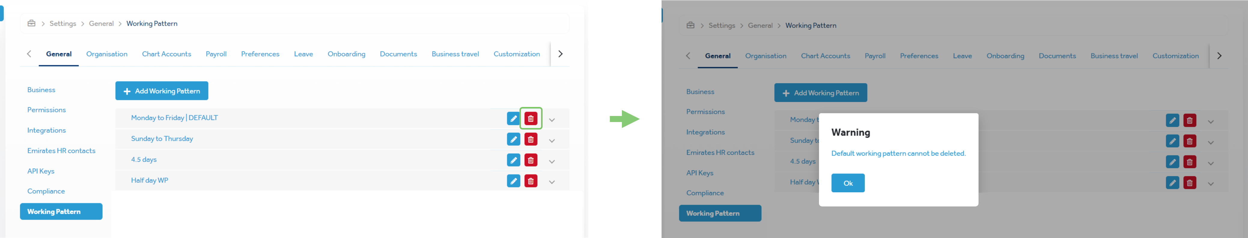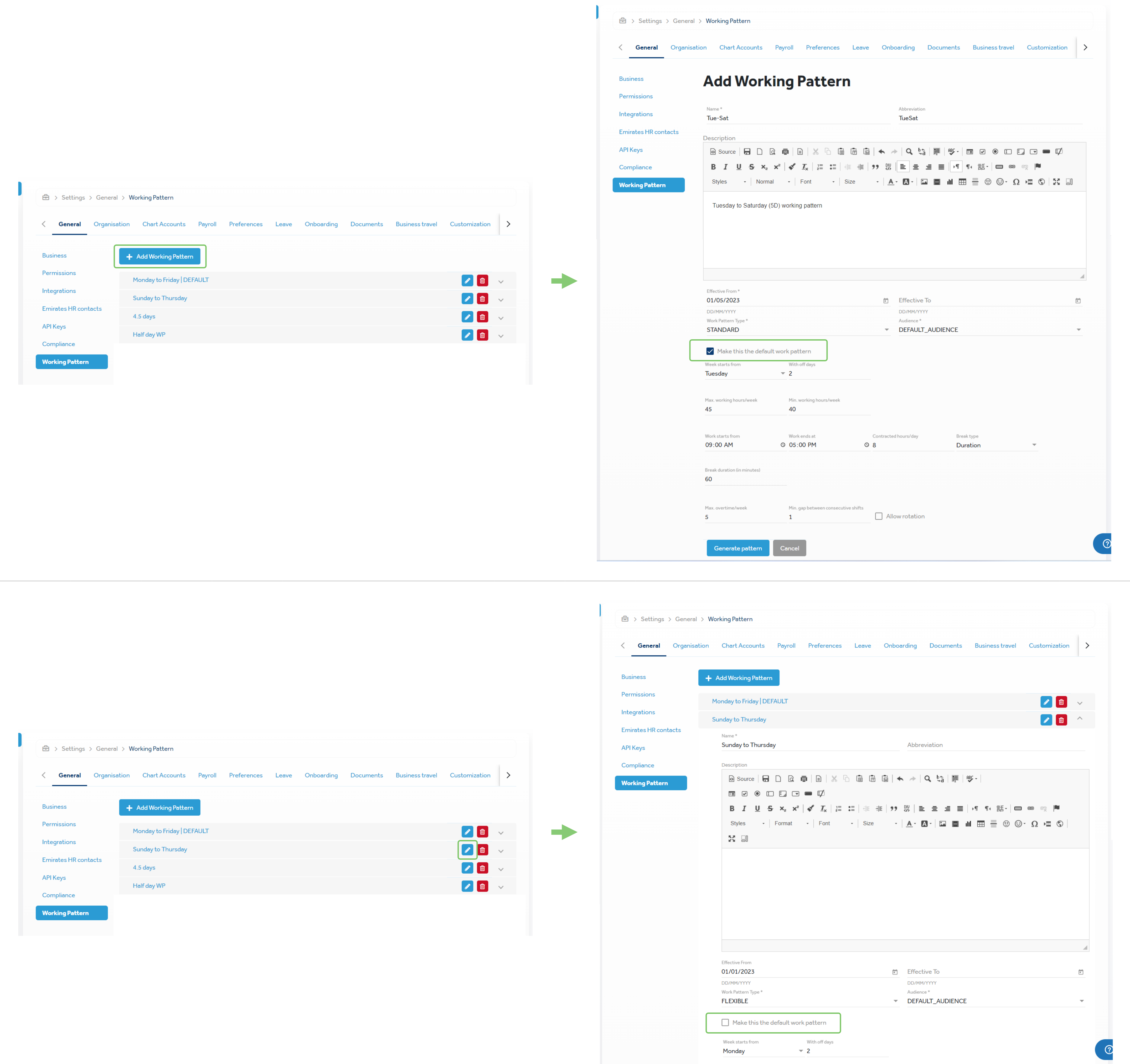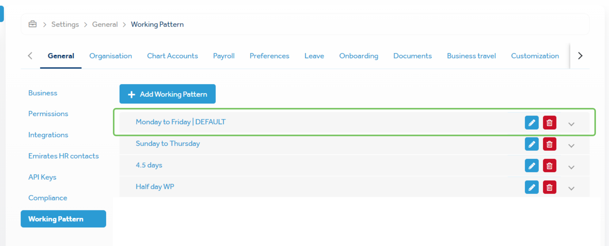 In this phase of enhancements, we have added new capabilities and enhancements to the following features: Default working patternsYou must configure a default working pattern for your business. When creating and configuring a new business, the first working pattern you create is automatically set as the default working pattern. However, when creating a new working pattern or editing an existing one, you can set it as the default working pattern. You cannot delete the default working pattern. If you need to delete it, you must first configure another working pattern as the default one. Calendar (generated pattern)When you create and configure a new working pattern, the generated pattern is represented as a calendar to help you visualize and understand the working pattern better. The calendar is enhanced to center itself around the working hours configured in the pattern. You can simply click a day in the calendar to toggle between configuring it as a working day or off day. You can now also view the calendar when doing the following: