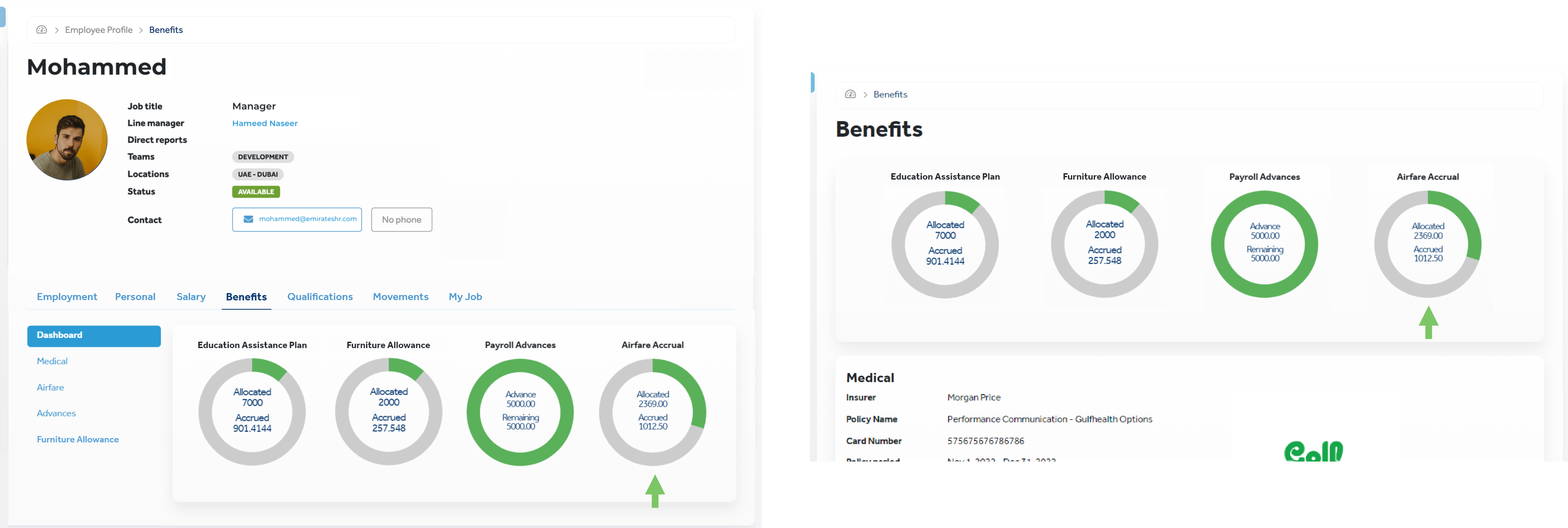On the Benefits dashboard (and Benefits > Dashboard tab in employee profiles), you can view the accrued and total amounts of your airfare benefit in a doughnut graph. When you accrue the total allocated amount for your accrual period, the doughnut graph is refreshed. For more information |