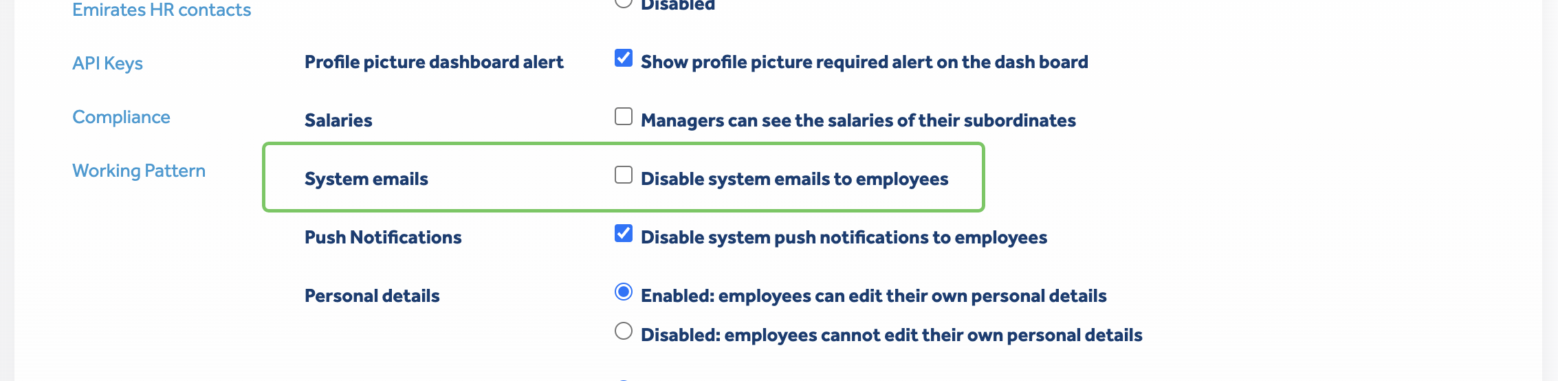 System emails, which include email notifications to employees about activity such as request approvals and pending actions, are enabled for your business.