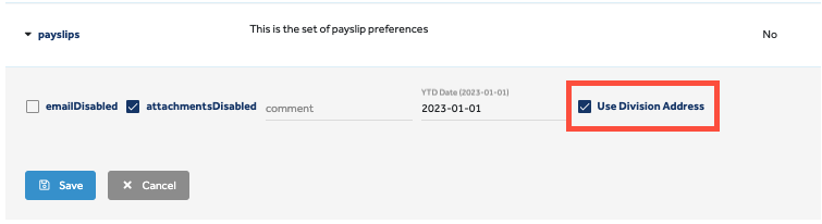 When customizing payslip preferences from your business settings, you can select the Use Division Address checkbox to display respective division addresses instead of the address of the organization's main branch in employee payslips.
