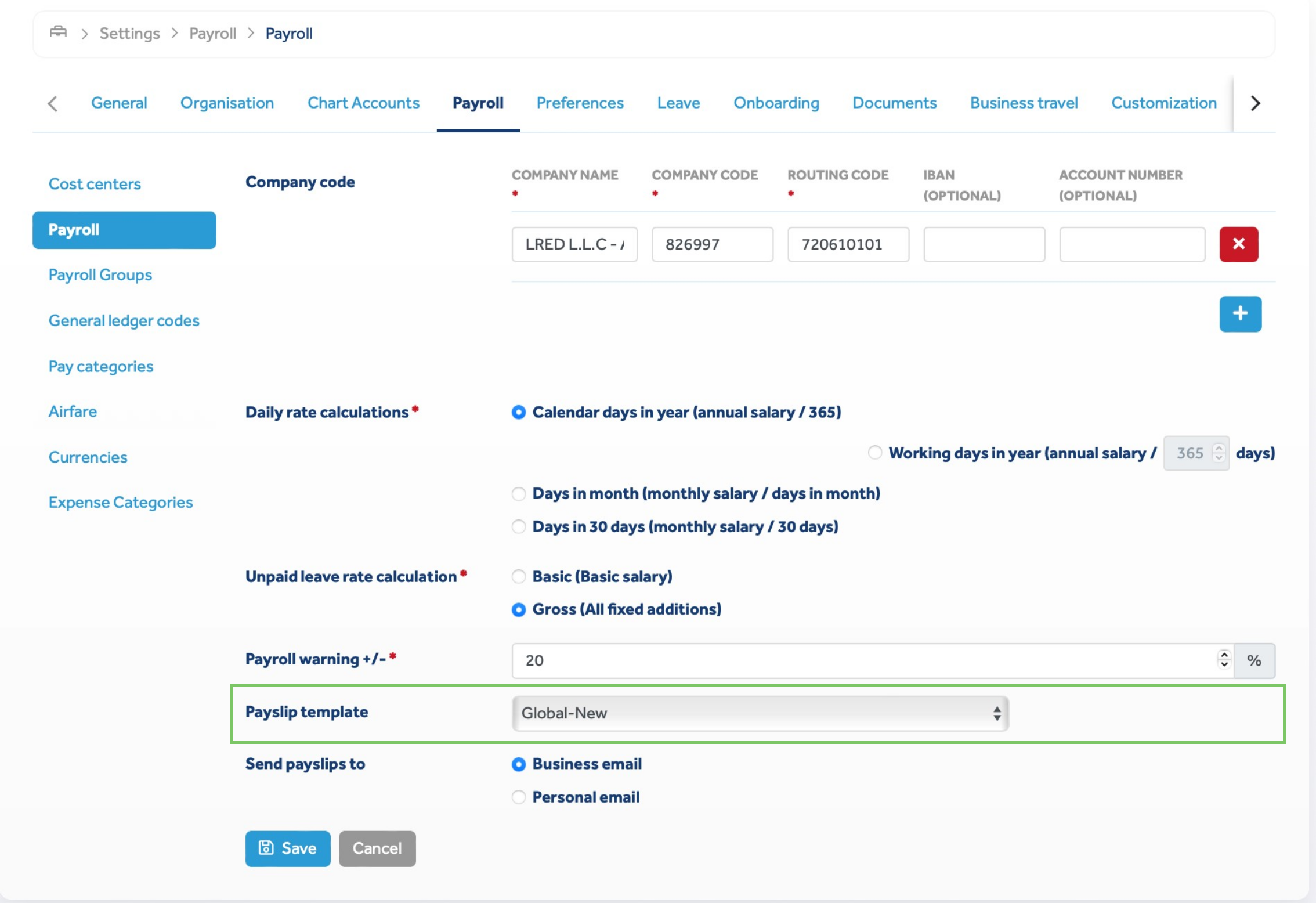 As a platform admin, you can select a different payslip template from your payroll settings in your business settings.