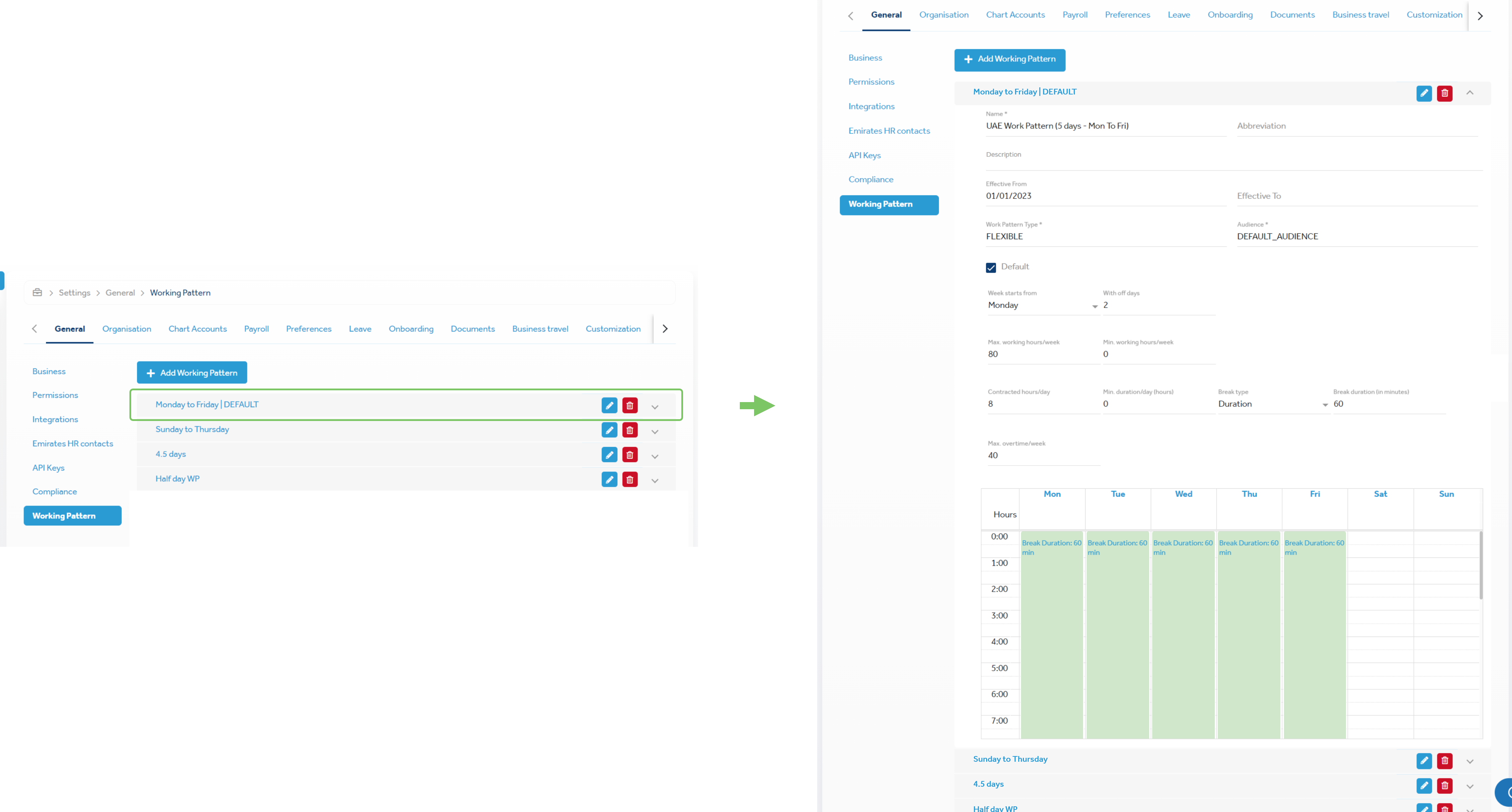 For example, you can create flexible working patterns to implement flexible work timings for employees. |